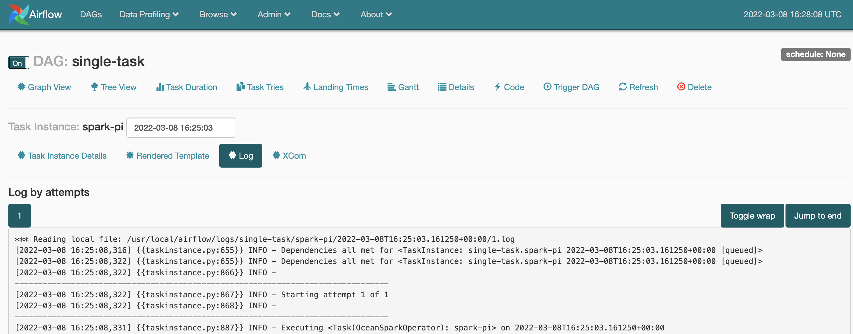 The example file below defines an Airflow DAG with a single task that runs the canonical Spark Pi on Ocean for Apache Spark.